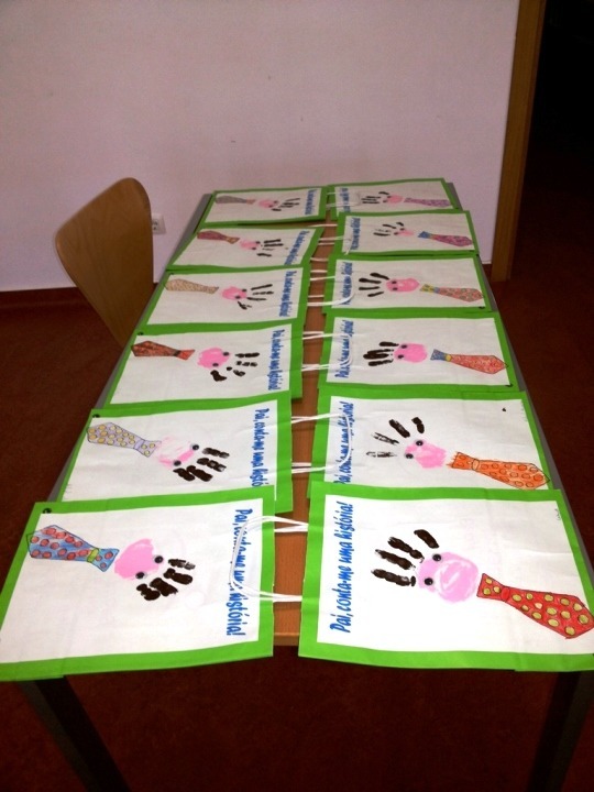 Cada criança escolheu um livro da Biblioteca para levar para casa para o pai ler. Este foi transportado num saco de papel personalizado pela criança.