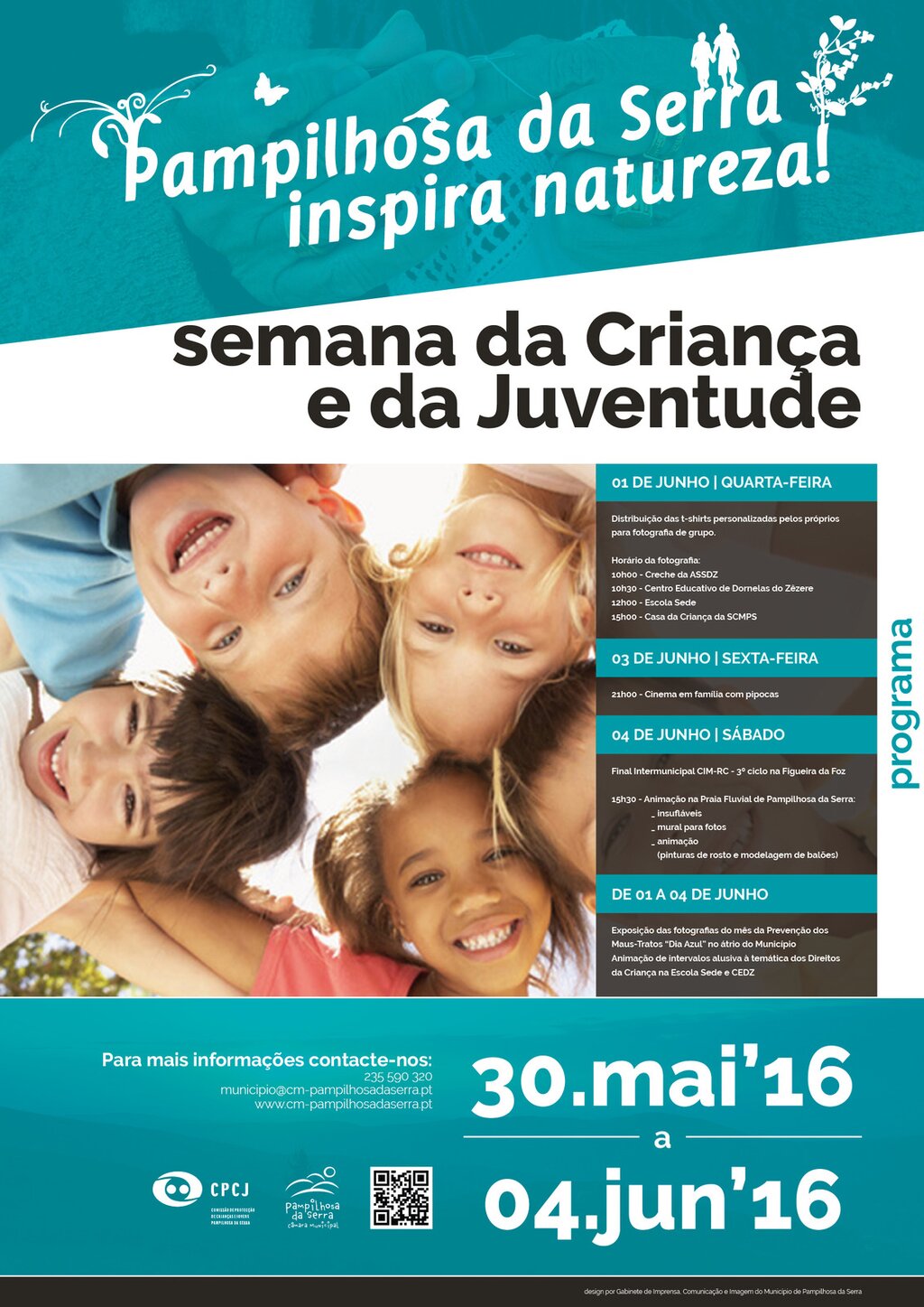 O Município de Pampilhosa da Serra e a CPCJ, em articulação com as Instituições locais e projetos que intervêm em matéria de infância e Juventude no concelho, vão dinamizar, de 30 de maio a 04 de junho, a Semana da Criança e da Juventude.