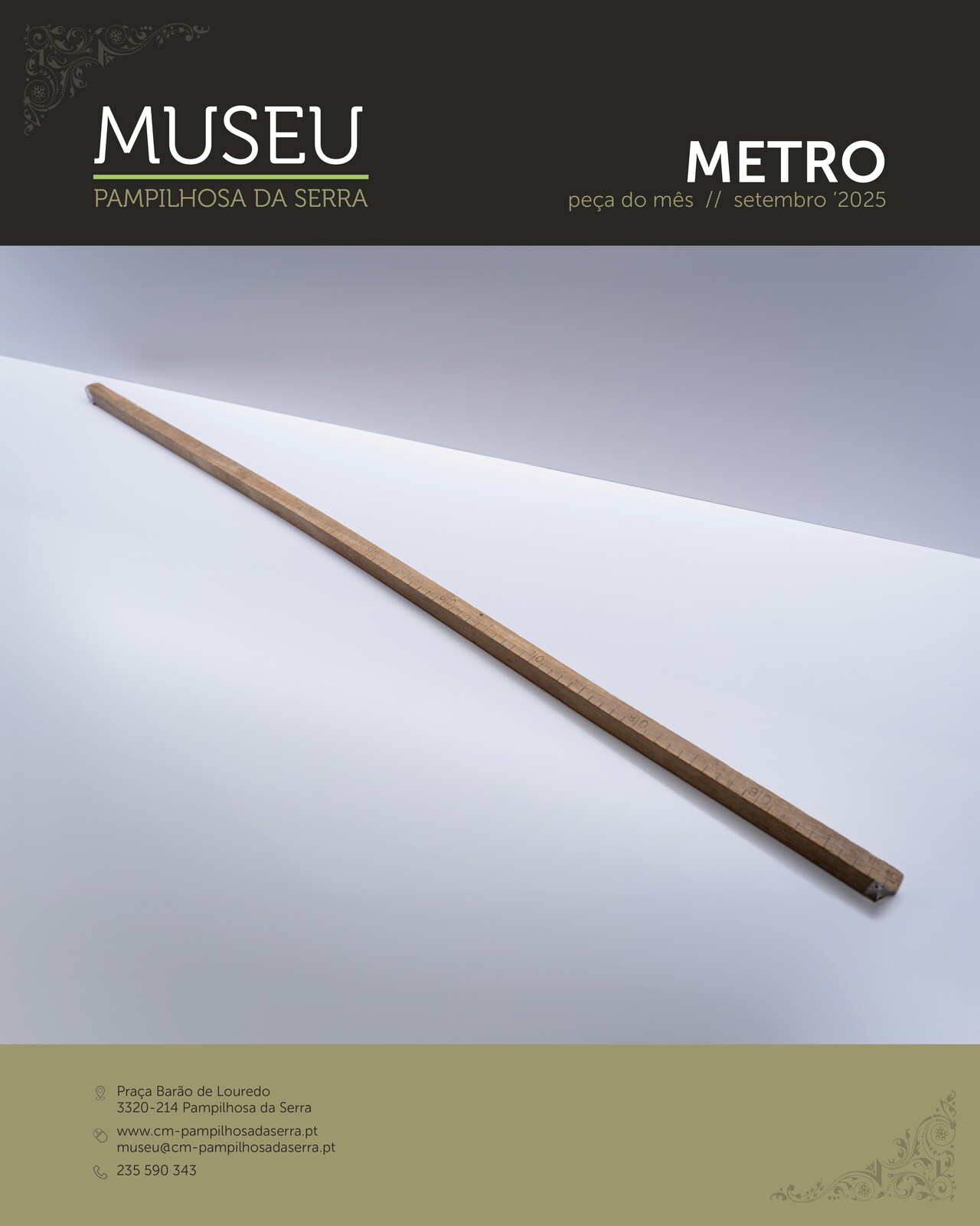 Proveniente das antigas escolas primárias do concelho, este metro fez parte do material didático utilizado pelos professores no ensino do sistema métrico. Este objeto representa uma fase importante da história da educação, bem como da padronização das medições em Portugal.