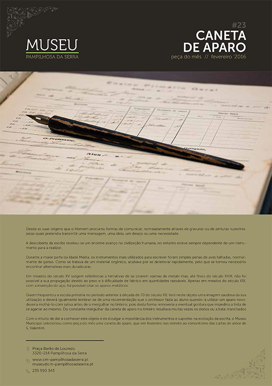 Com o intuito de dar a conhecer este objeto e de divulgar a importância dos instrumentos e suportes na evolução da escrita, o Museu Municipal selecionou como peça do mês uma caneta de aparo, que em fevereiro nos remete ao romantismo das cartas de amor de S. Valentim.