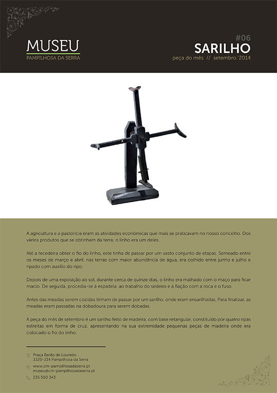 A peça do mês de setembro é um sarilho feito de madeira, com base retangular, constituído por quatro ripas estreitas em forma de cruz, apresentando na sua extremidade pequenas peças de madeira onde era colocado o fio do linho.