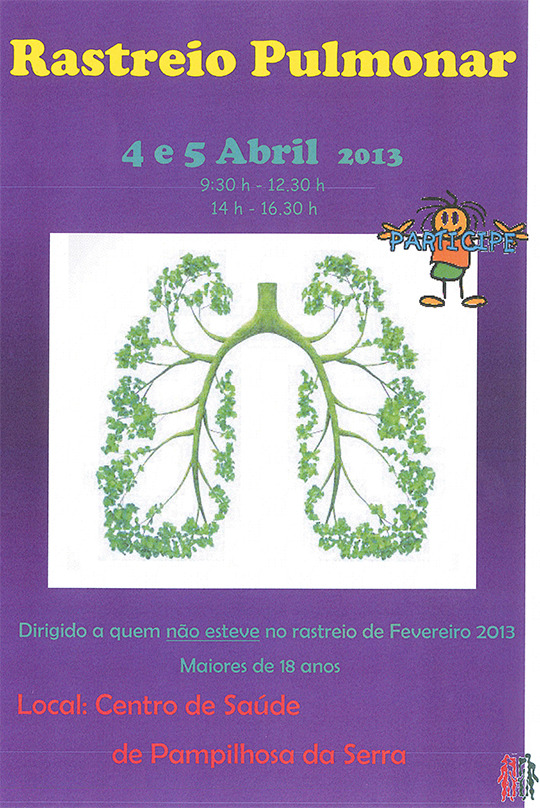Vai realizar-se nos próximos dias 04 e 05 de abril, entre as 9h30 e as 12h30 e as 14h00 e as 16h30, um Rastreio Pulmonar gratuito.
