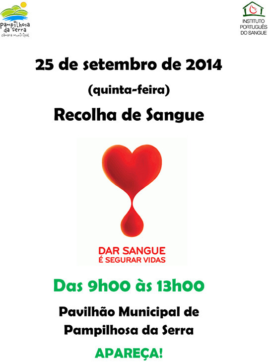 O Instituto Português do Sangue em colaboração com o Município de Pampilhosa da Serra irá promover mais uma iniciativa de recolha de sangue, dirigida a toda a comunidade local, no próximo dia 25 de setembro (quinta-feira), das 09h00 às 13h00, no Pavilhão Municipal de Pampilhosa da Serra.