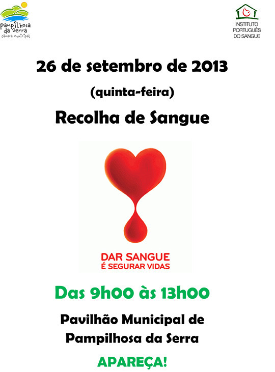 O Instituto Português do Sangue em colaboração com o Município de Pampilhosa da Serra irá promover mais uma iniciativa de recolha de sangue, dirigida a toda a comunidade Pampilhosense, no próximo dia 26 de setembro (quinta-feira), das 09h00 às 13h00, no Pavilhão Municipal de Pampilhosa da Serra.
