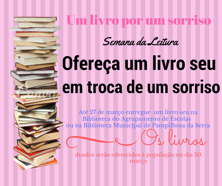 A Biblioteca Escolar do Agrupamento de Escolas Escalada, Pampilhosa da Serra, com a colaboração da Biblioteca Municipal, está a promover a campanha de angariação de livros “Um livro por um sorriso”. Esta iniciativa consiste na recolha de livros novos ou usados de vários géneros, que serão distribuídos à população, no dia 30 de março, em frente aos Paços do Concelho.