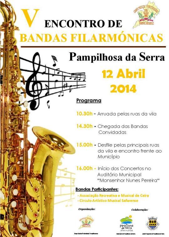 Vai realizar-se no próximo dia 12 de abril, a partir das 10.30h, o 5.º encontro de Bandas em Pampilhosa da Serra, uma organização do Grupo Musical Fraternidade Pampilhosense com a colaboração da Câmara Municipal e da Junta de Freguesia de Pampilhosa da Serra.
