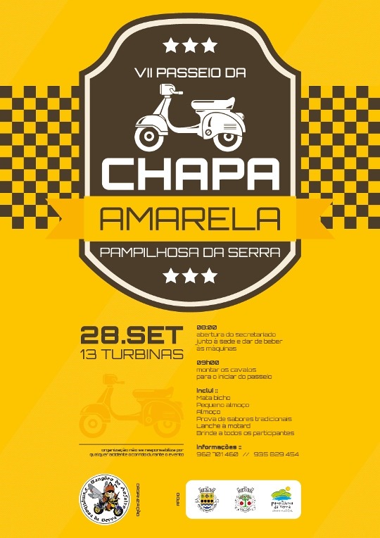 No próximo dia 28 de setembro o Grupo Motard Zangões do Asfalto em parceria com o Município de Pampilhosa da Serra e as Juntas de Freguesia de Pampilhosa da Serra e de Pessegueiro, irão levar a cabo o VII Passeio da Chapa Amarela.