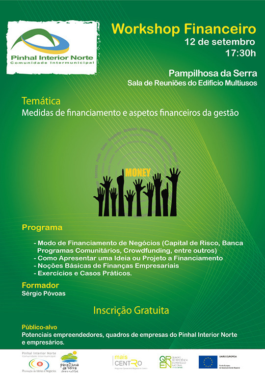 Integrado no Projeto da Rede Regional de Apoio ao Empreendedor no Pinhal Interior Norte, vai decorrer no próximo dia 12 de setembro, um Workshop Financeiro para potenciais empreendedores e empresários, no âmbito da temática "Medidas de financiamento e aspetos financeiros da gestão".