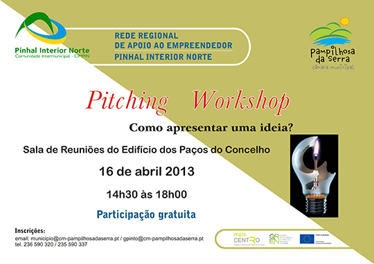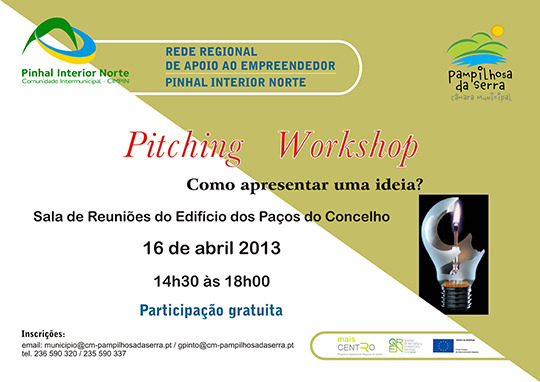 O Workshop Pitching - Como apresentar uma ideia? decorrerá em Pampilhosa da Serra, no dia 16 de abril de 2013, entre as 14h30 e as 18h, na Sala de Reuniões do Edifício dos Paços do Concelho.