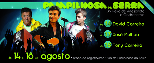O concelho de Pampilhosa da Serra muito se orgulha de ter o aclamado e reconhecido artista nacional e internacional Tony Carreira no seu programa, neste ano em que se comemoram 15 anos de Feira de Artesanato e Gastronomia. Efetivamente, trata-se de um artista de origem Pampilhosense, e que certamente os seus sonhos de menino de uma terra na Beira que o viu nascer encantarão uma vez mais com a sua atuação em Pampilhosa da Serra, no dia 18 de agosto a encerrar as festividades.