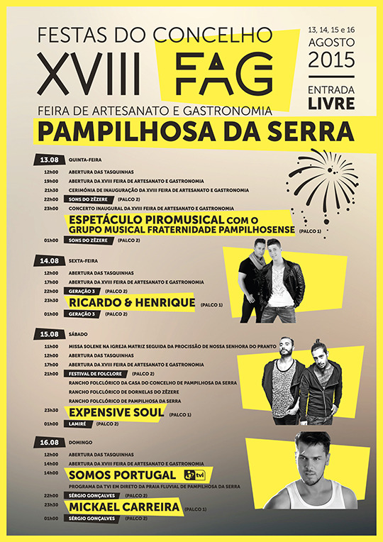 Assim, no dia 13 de agosto (quinta-feira) teremos o Concerto Inaugural da XVIII Feira de Artesanato e Gastronomia, um Espetáculo Piromusical com o Grupo Musical Fraternidade Pampilhosense - (Palco 1). Nesse mesmo dia teremos ainda a atuação dos Sons do Zêzere (Palco 2).